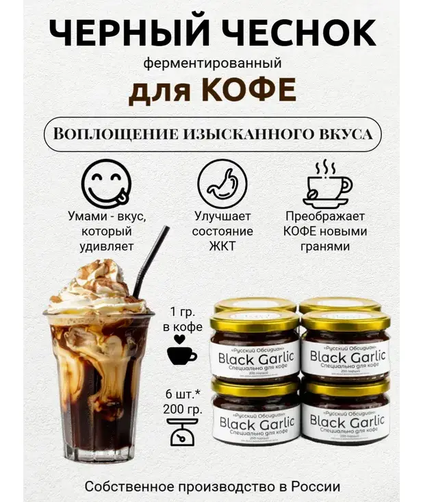 Попробуйте пасту Black Garlic для кофе от «Русский Обсидиан» и откройте для себя ваш любимый напиток с новой, удивительной стороны. В одной упаковке — 100 порций. Удобно, выгодно, интересно! 100% натуральный продукт собственного производства — гарантия качества и уникальности каждого вкуса.