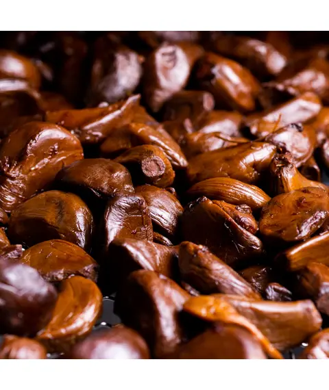 Мы разработали собственную технологию производства. В течение 30-45 дней в герметичной камере происходит особая ферментация отборных зубчиков чеснока. Выделяющийся сок циркулирует через конденсаторы, насыщаясь полезными веществами. На выходе мы получаем сразу два продукта: собственно черный чеснок и жидкий концентрат.